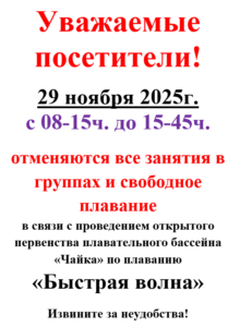 Отмена занятий 29 ноября (суббота) Уважаемые посетители! 29 ноября 2025г. с 08-15ч. до 15-45ч. отменяются все занятия в группах и свободное плавание в связи с проведением открытого первенства плавательного бассейна «Чайка» по плаванию «Быстрая волна» Извините за неудобства! 2025-11-27 admin-chayka