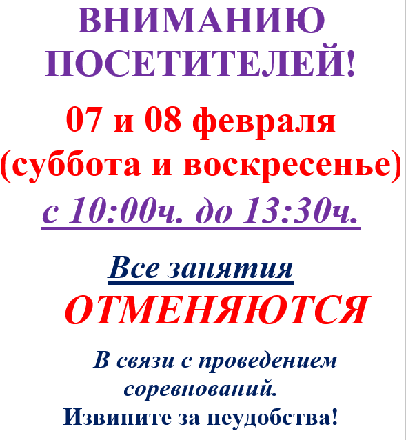 Отмена занятий в связи с проведением соревнований «Мастерс» ВНИМАНИЮ ПОСЕТИТЕЛЕЙ! 07 и 08 февраля (суббота и воскресенье) с 10:00ч. до 13:30ч. Все занятия ОТМЕНЯЮТСЯ В связи с проведением соревнований. Извините за неудобства! 2026-02-06 admin-chayka