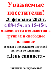 Отмена сеансов — матчевая встреча «День спиниста» 20.02.2026 Уважаемые посетители! 20 февраля 2026г. с 08-15ч. до 15-45ч. отменяются все занятия в группах и свободное плавание в связи с проведением матчевой встречи по плаванию «День спиниста» Извините за неудобства! 2026-02-19 admin-chayka